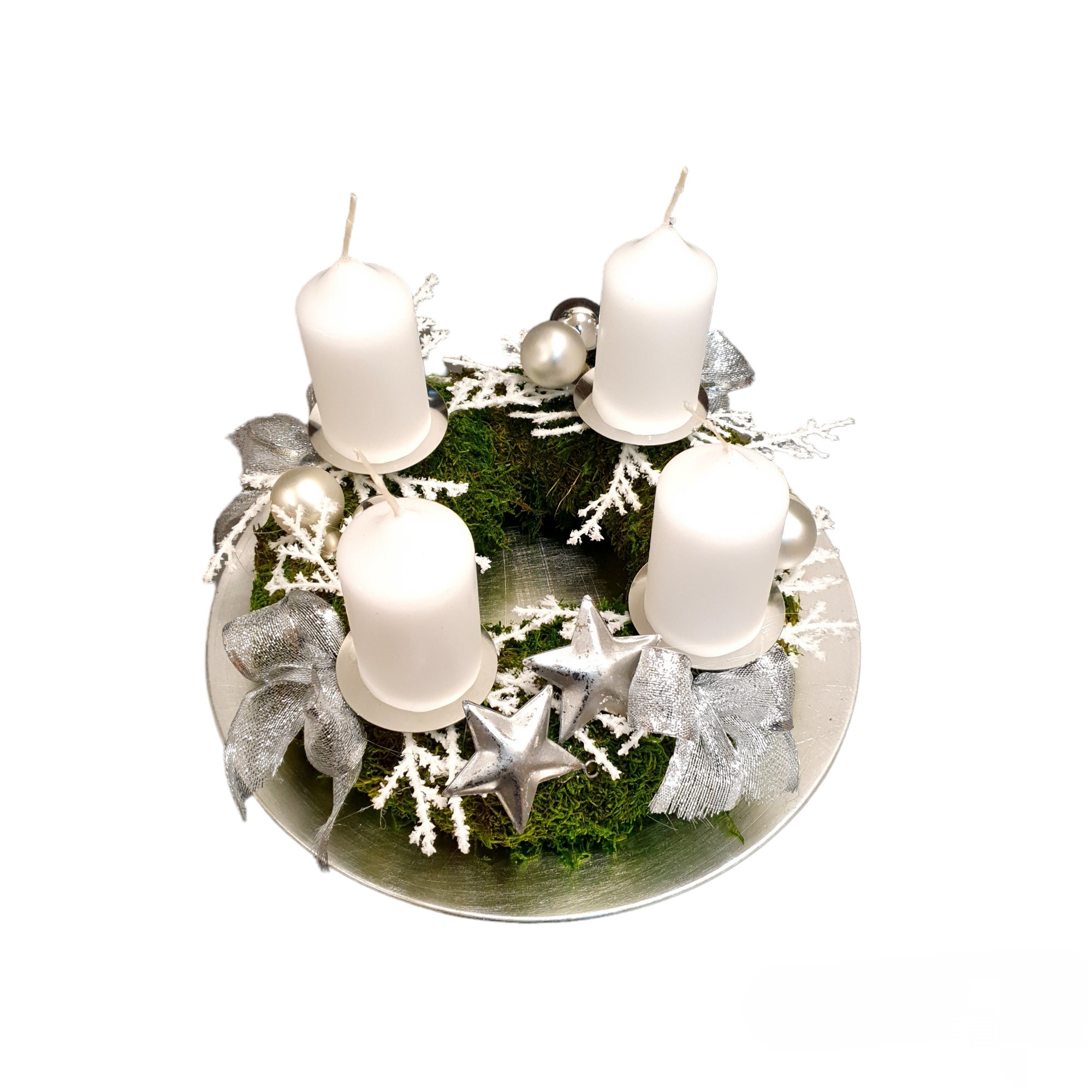 Adventní věneček na stůl ze stabilizovaného mechu, průměr 20 cm. Stříbrný tác z plastu o průmeru 24cm je součástí, věneček na něm leží, ale není připevněný. Je možné objednat i v jiných barvách.