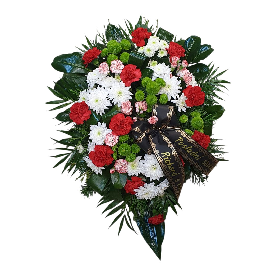 | 12 ks karafiát, 4 ks chryzantema, 6 ks chryzantema Santini, 6 ks karafiát trsový, smuteční stuha, zeleň |